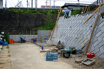 住宅を建てる為に土地を整備する事業です。地面を平らに均し、区画割のブロック積をします。